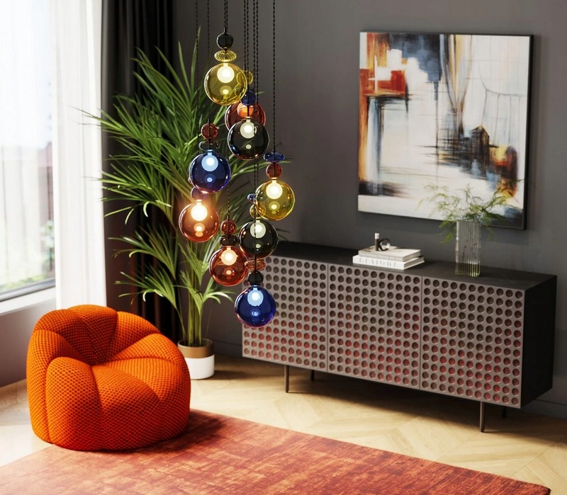 Dziewięć szklanych kul pełniących funkcję kloszy zapewnia przytulne, nastrojowe światło, jednocześnie stanowiąc dekoracyjny element przyciągający wzrok.
