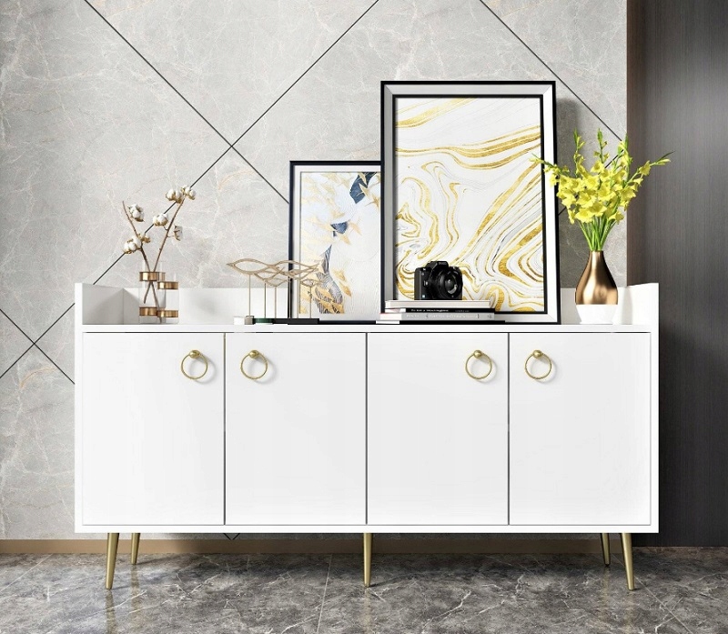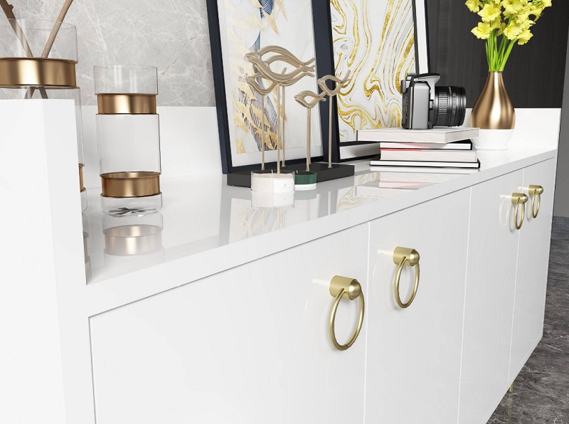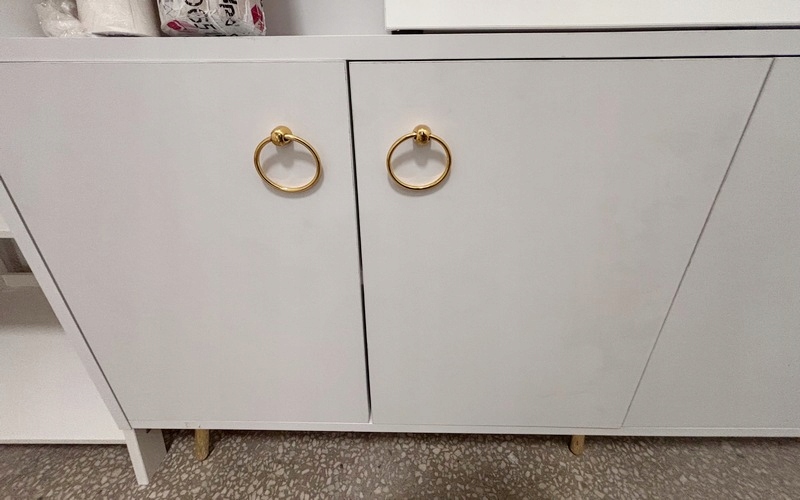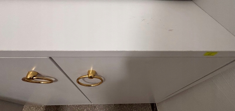 Uchwyty i nóżki ze złotymi zdobieniami dodają komodzie eleganckiego charakteru.