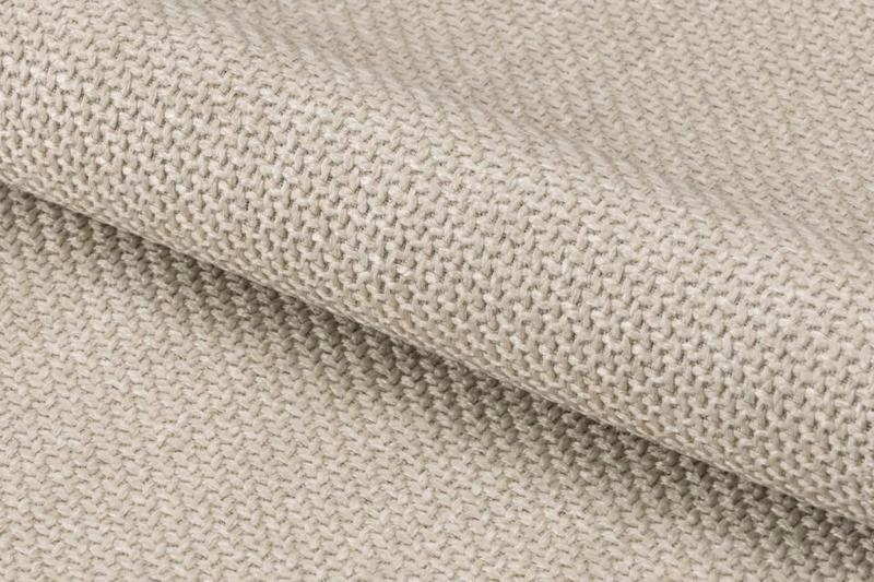 Tapicerka ze strukturalnej tkaniny w kolorze beżowym o subtelnym dwukolorowym efekcie nadaje wnętrzu ciepła, a poziome przeszycia podkreślają jego stylowy charakter.