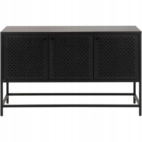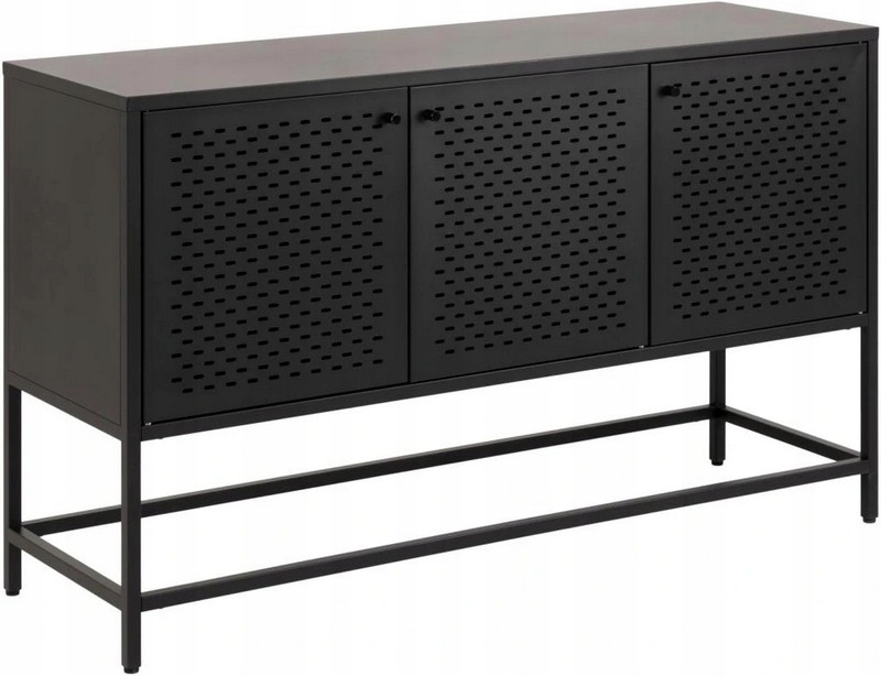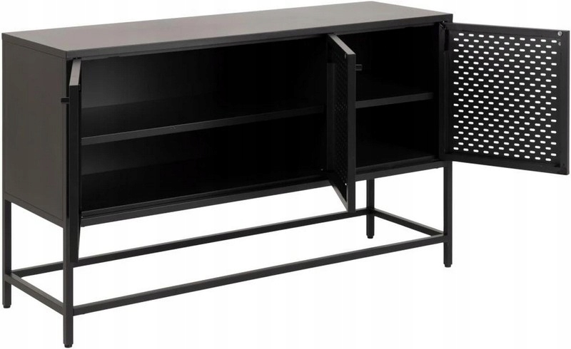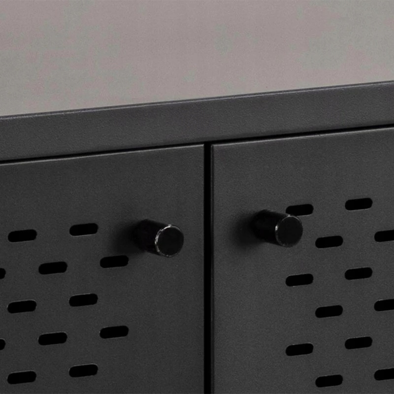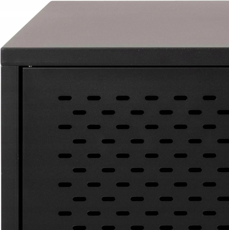 Perforowane fronty z metalowej siatki podkreślają industrialny design, a jednocześnie nadają meblowi lekkości.