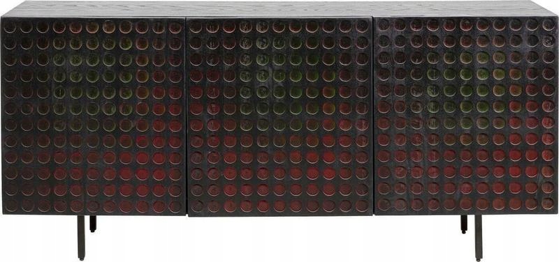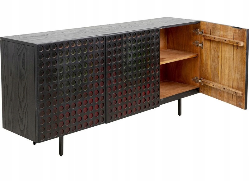 Czarna, lakierowana struktura drewna mango została efektownie zestawiona z zielono-czerwoną gradacją na tłoczonych drzwiach, tworząc unikatowy i przyciągający wzrok front.