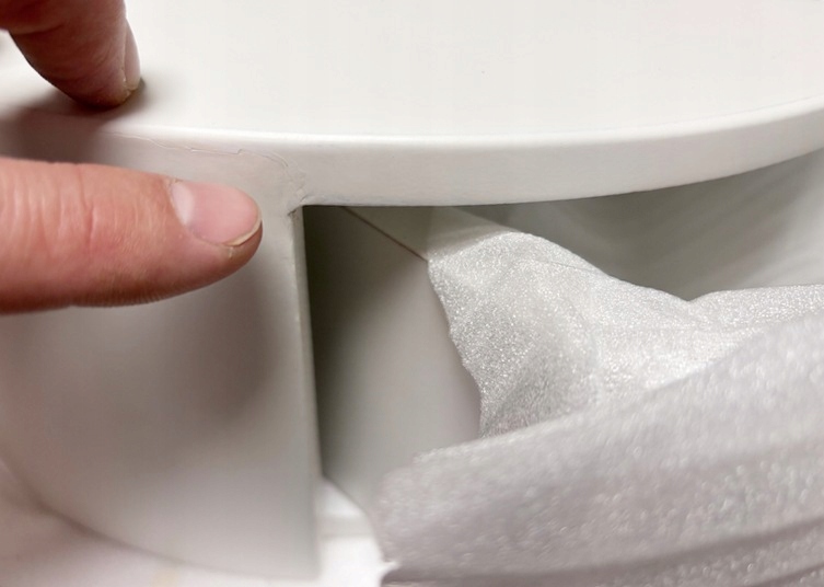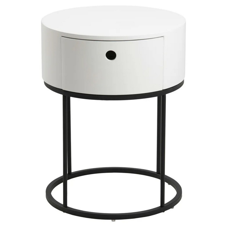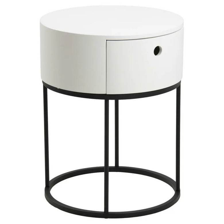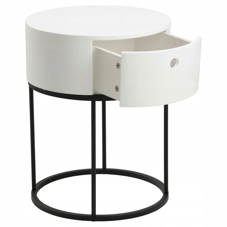 Biała okrągła powierzchnia szafki z subtelnymi liniami i czarna metalowa podstawa to zestawienie, które zapewnia harmonijne połączenie stylu i funkcjonalności.