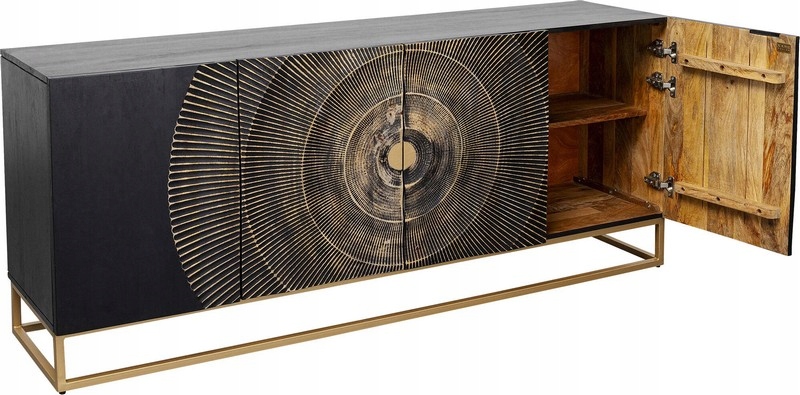 Ręcznie wykonane, rzeźbione fronty z litego drewna mango tworzą efektowną strukturę 3D, nadając kredensowi niepowtarzalny i artystyczny charakter.