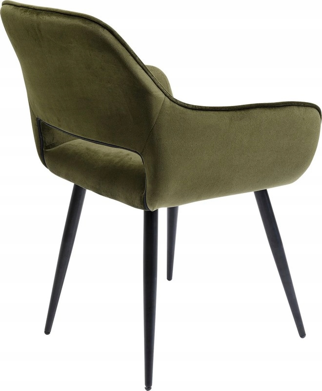 Miękka w dotyku tapicerka z łatwych w pielęgnacji włókien syntetycznych w modnym, ciemnozielonym kolorze pięknie komponuje się z drewnem i naturalnymi barwami wnętrz.