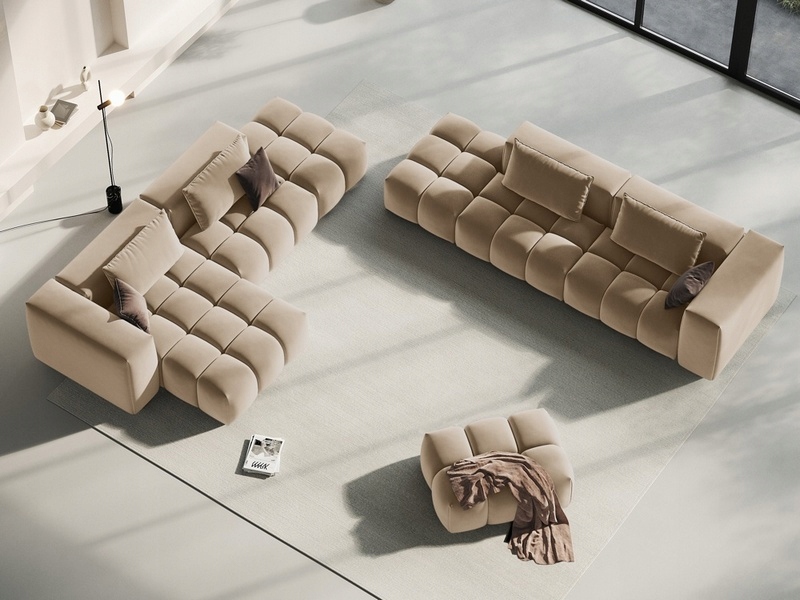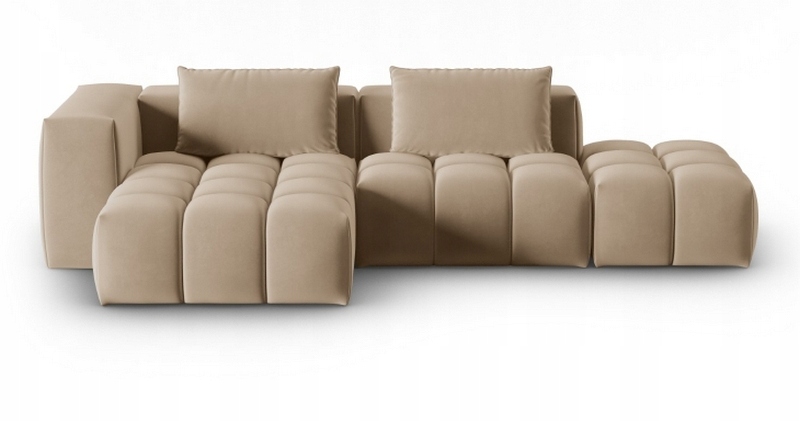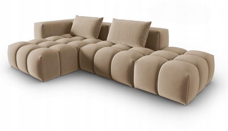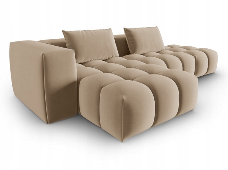 Obita wysokiej jakości welurem w modnym odcieniu piaskowym, wnosi do wnętrza lekkość i przytulny charakter.