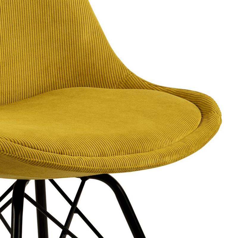Tapicerowane siedzisko i oparcie w kolorze żółtym przyciąga wzrok i ożywia aranżację, a jego organiczny kształt naturalnie dopasowuje się do pleców, wspierając prawidłową postawę podczas siedzenia. Miękka poduszka zapewnia wysoki komfort nawet podczas długich posiłków i spotkań przy stole.