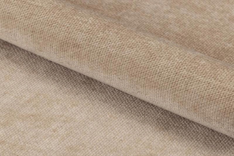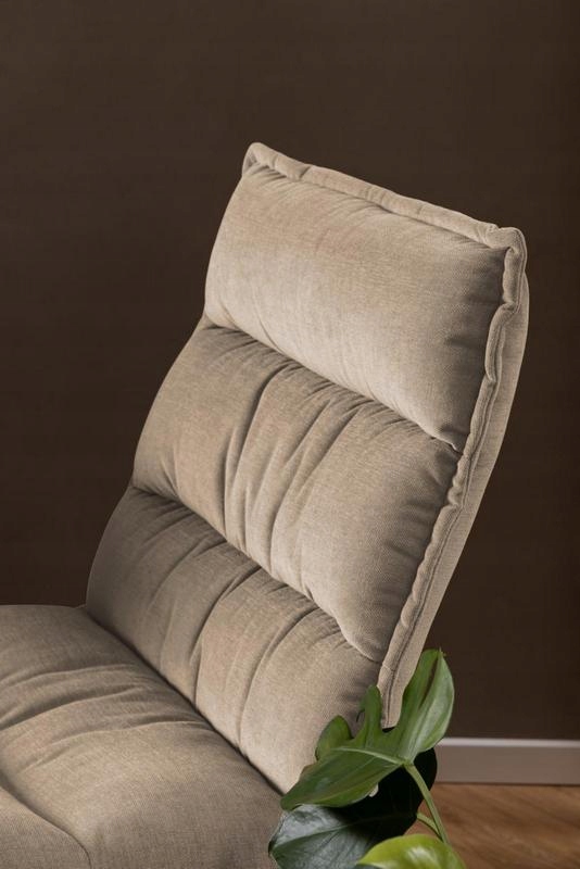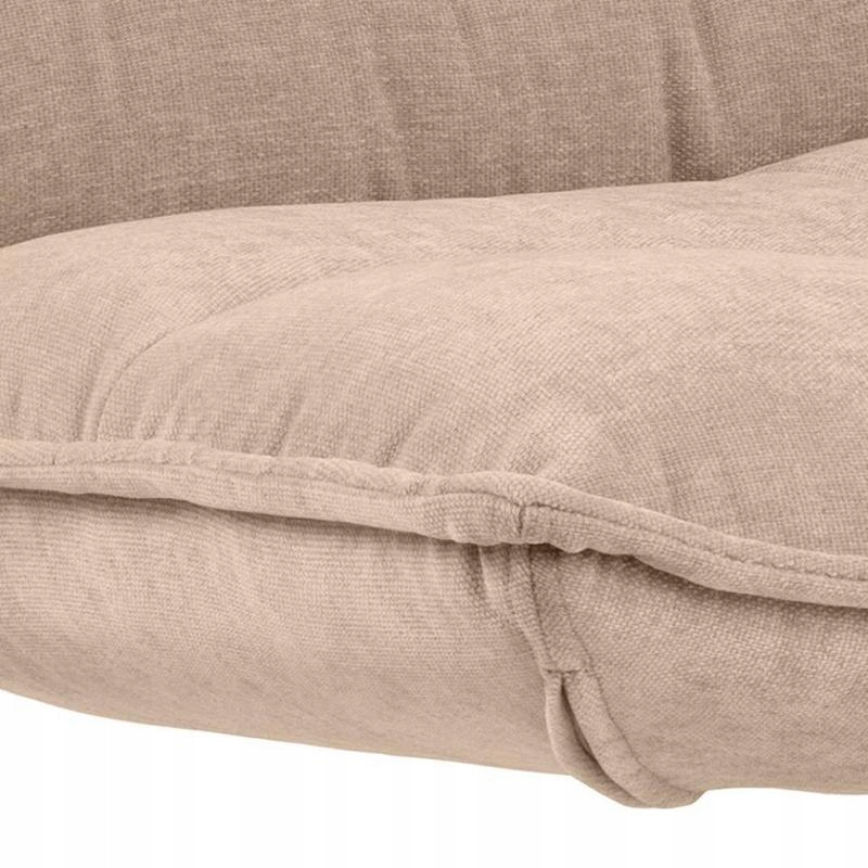 Beżowe poszycie o strukturze przypominającej szenil, uzupełnione dekoracyjnymi poziomymi przeszyciami, podkreśla miękką, masywną sylwetkę fotela i zachęca do komfortowego wypoczynku.