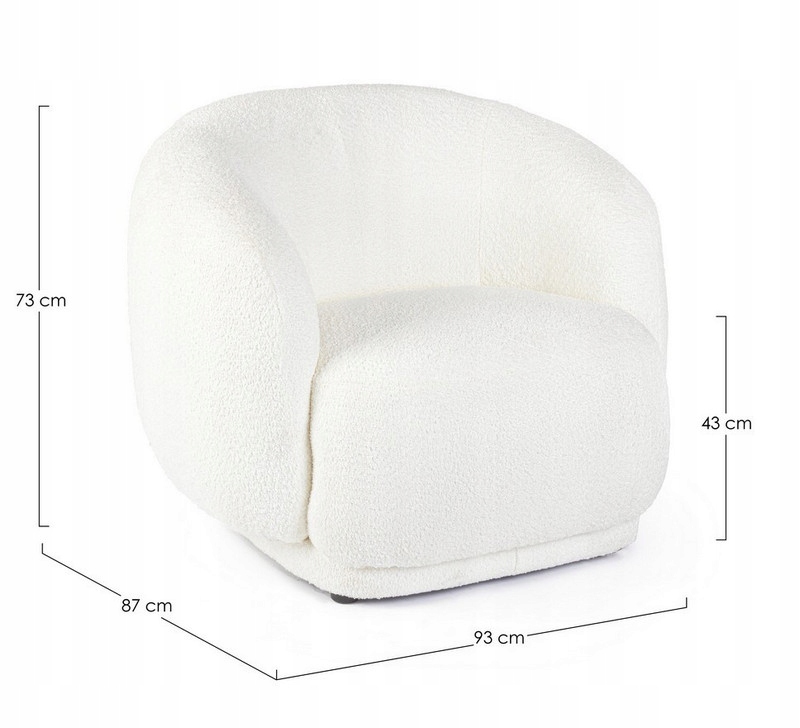 Ten wyjątkowy mebel łączy w sobie nowoczesną formę z przyjemną w dotyku, klasyczną tkaniną bouclé, która nadaje siedzisku miękkość i unikalny charakter.