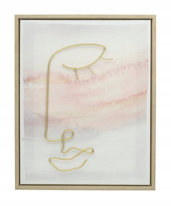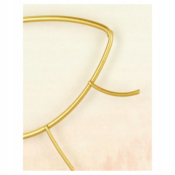 Dekoracyjna grafika przedstawiająca zarys twarzy kobiecej wykonanej z metalowego druciku w kolorze złotym.