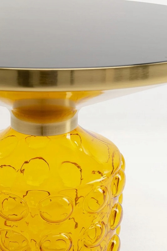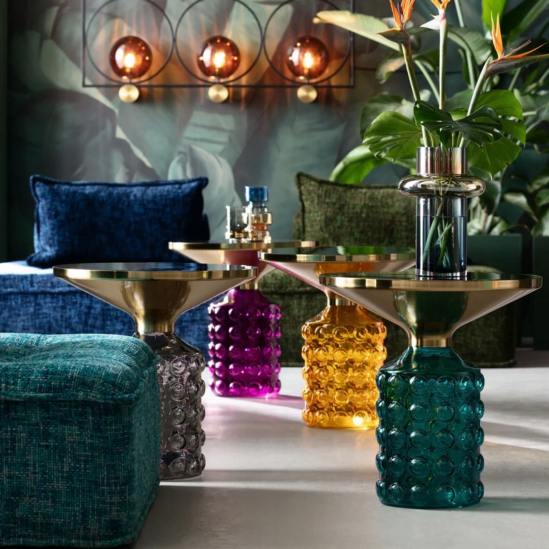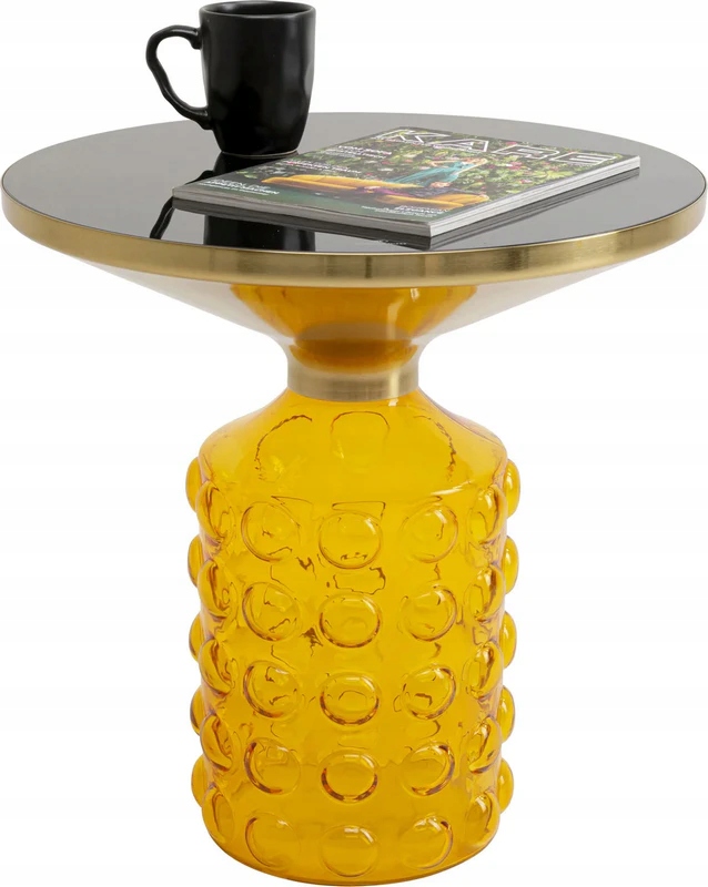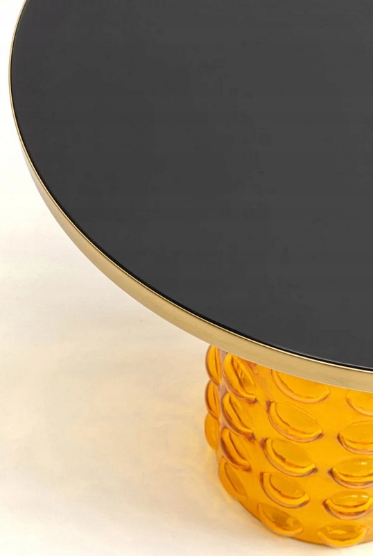 Okrągły stolik kawowy Lola to wyjątkowe połączenie sztuki użytkowej i nowoczesnego designu. Rzeźbiarska noga z kolorowego szkła przyciąga wzrok i nadaje wnętrzu dynamiczny, artystyczny charakter.
