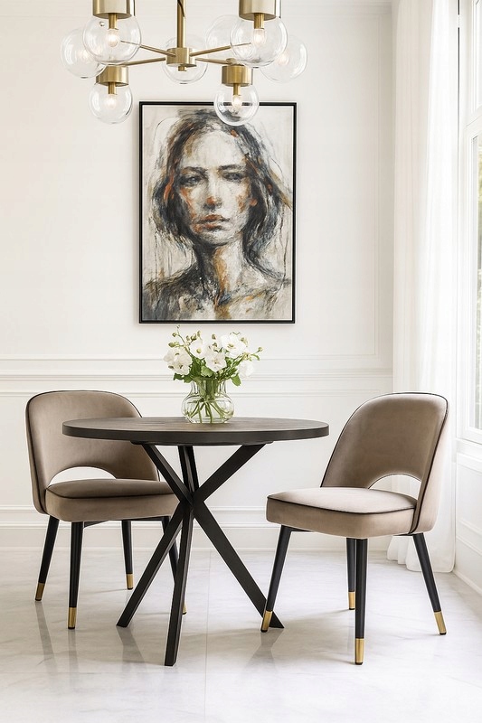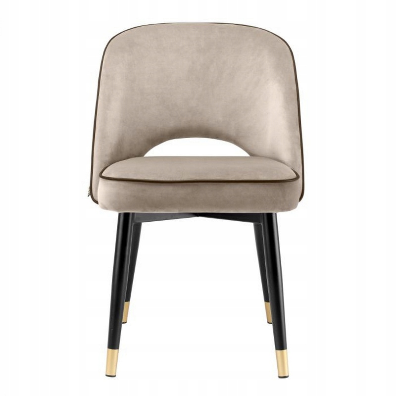Czarne, stalowe nogi w kształcie stożków zwieńczone są eleganckimi, złotymi akcentami, dodającymi szyku całej konstrukcji. Charakterystyczna czarna lamówka ze sztucznej skóry podkreśla stylową linię mebla, czyniąc z niego wyjątkowy element każdej jadalni.