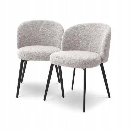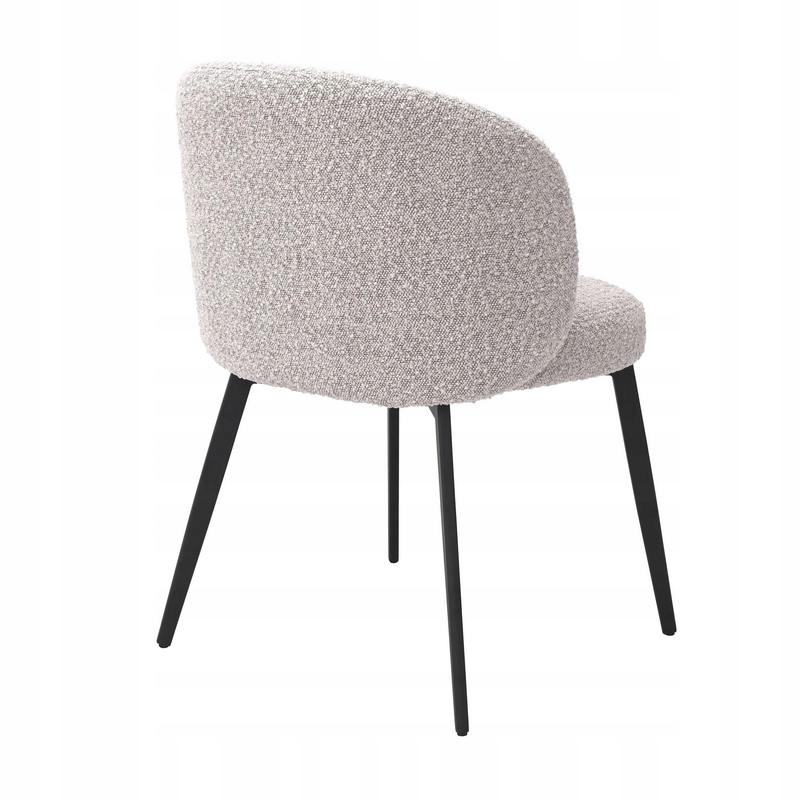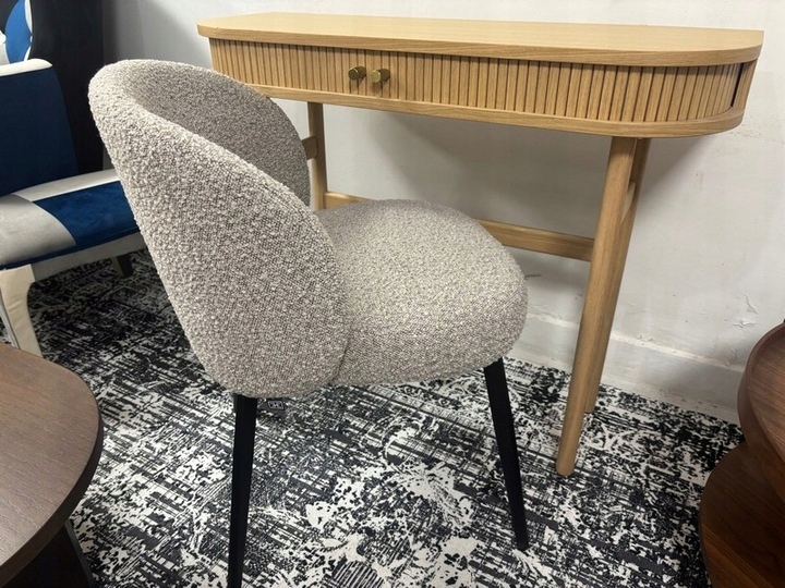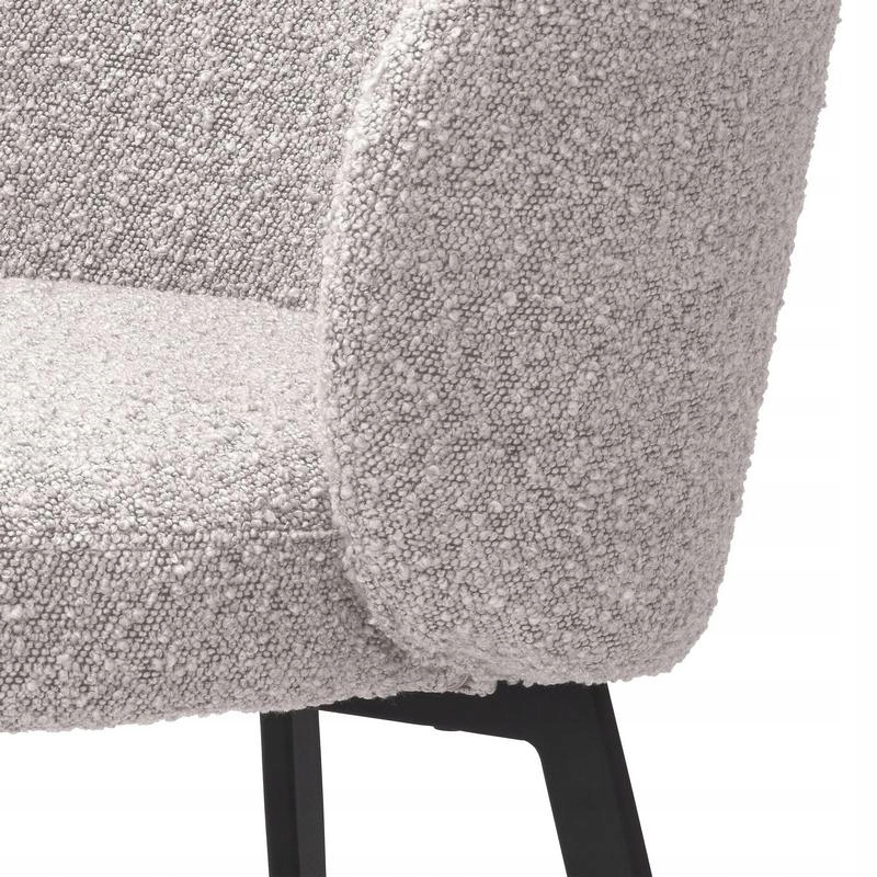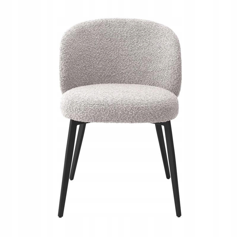 Miękka tapicerka w szarym odcieniu tkaniny bouclé zaprasza do odpoczynku, a zaokrąglone, starannie wyściełane oparcie dba o wygodę nawet podczas długich spotkań przy stole.