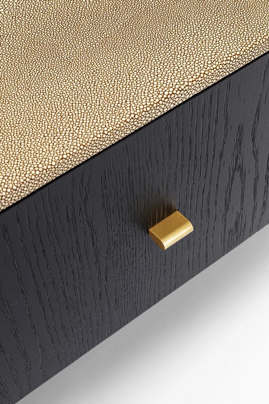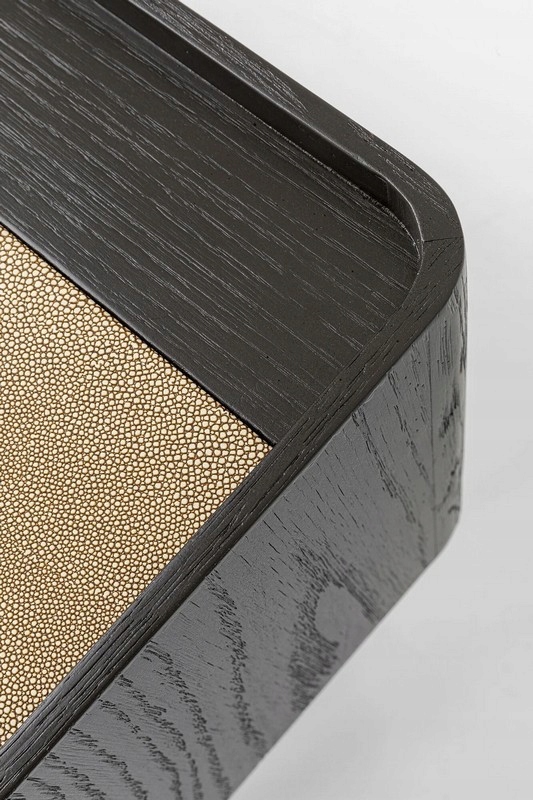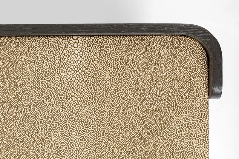 Korpus z fornirowanej sklejki w ciemnobrązowym odcieniu doskonale komponuje się ze stalowymi nogami i uchwytami ze szczotkowanej stali, a panel z tkaniny powlekanej poliuretanem dodaje subtelnej lekkości.