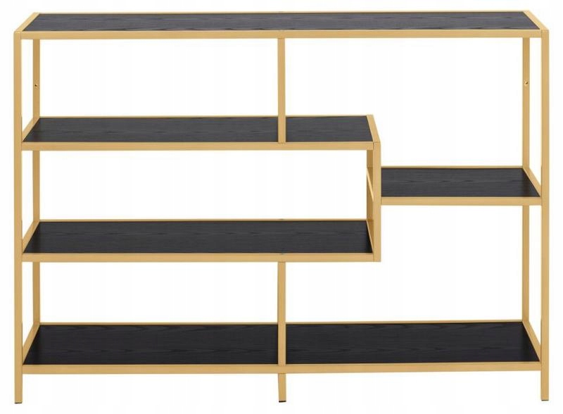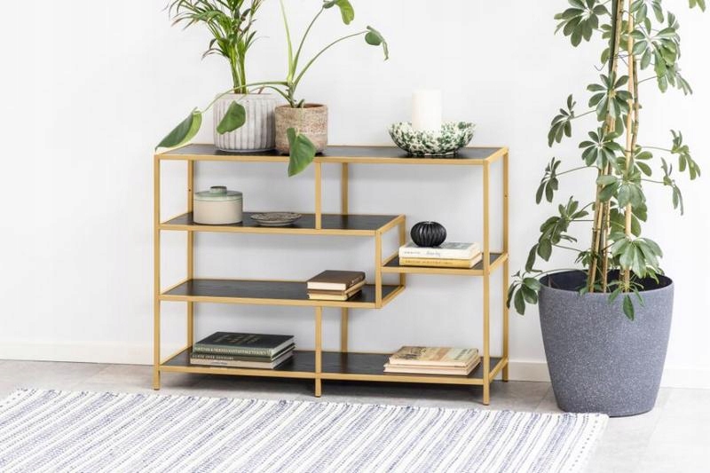 Konstrukcja z malowanej proszkowo stali w kolorze złotym nadaje lekko luksusowego charakteru, a cztery półki z czarnej melaminy o subtelnej, surowej strukturze podkreślają nowoczesny styl.