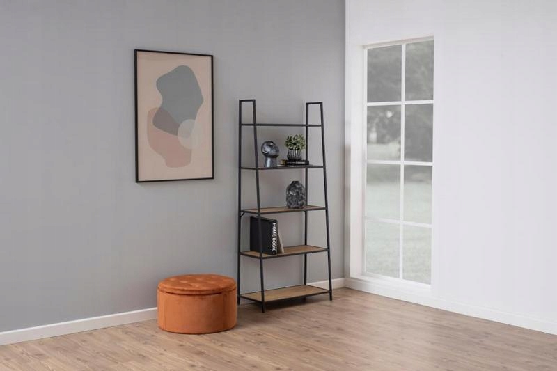 Pięć pojemnych półek zapewnia dużo miejsca na książki, dekoracje i rośliny, a lekka forma regału drabinkowego nie przytłacza wnętrza. Dzięki uniwersalnej stylistyce świetnie odnajdzie się zarówno w aranżacjach industrialnych, skandynawskich, jak i nowoczesnych.