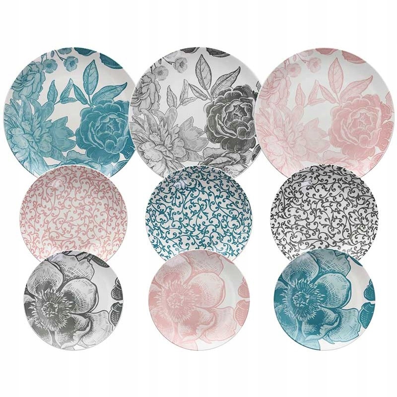 Serwis wykonany ze szlachetnej porcelany posiada wspaniałe dekoracje kwiatowe w odcieniach różu, błękitu i czerni.