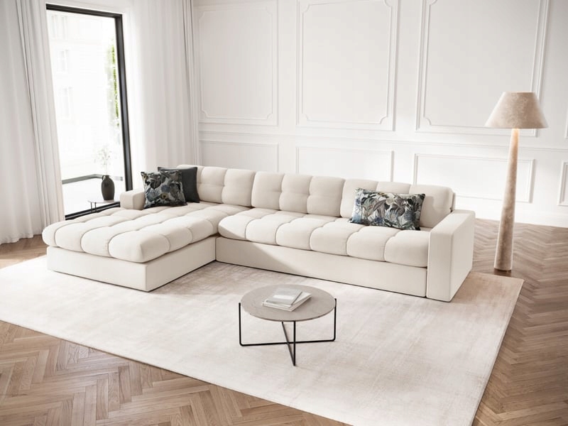 Sofa narożna Yohan 4-osobowa to połączenie nowoczesnej prostoty i przytulnego charakteru. Jasnobeżowa tapicerka w tkaninie strukturalnej nadaje wnętrzu lekkości i ciepła, doskonale wpisując się w aranżacje skandynawskie, minimalistyczne oraz modern classic.