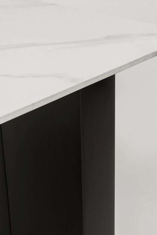 Prostokątny, ceramiczny blat o polerowanym wykończeniu zachwyca minimalistycznym wyglądem oraz trwałością, idealnie wpisując się w nowoczesne aranżacje wnętrz.