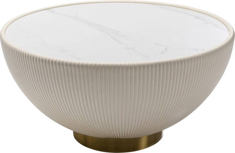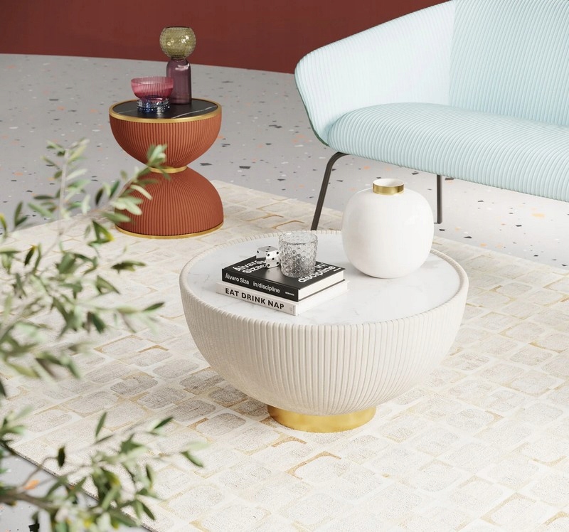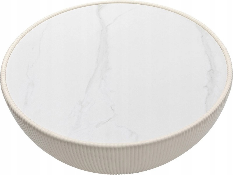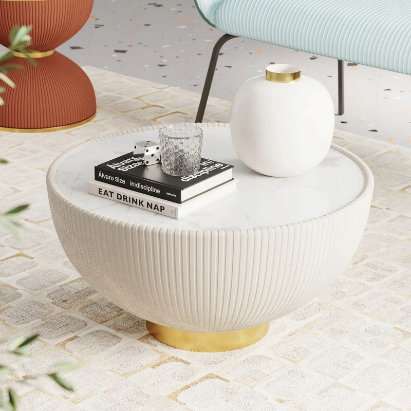 Okrągła forma i kremowo-biała kolorystyka nadają mu lekkości, dzięki czemu sprawdzi się zarówno jako stolik kawowy w salonie, jak i stolik nocny w sypialni.