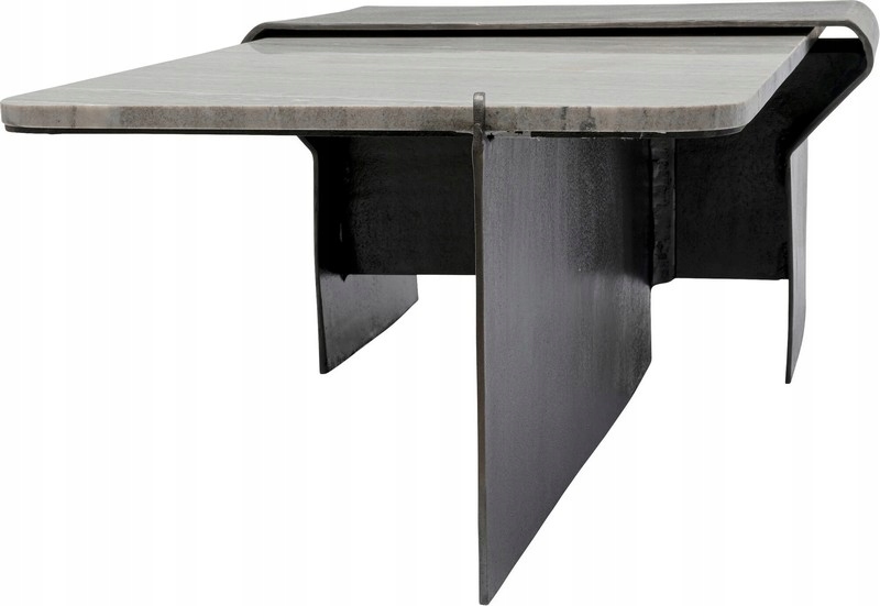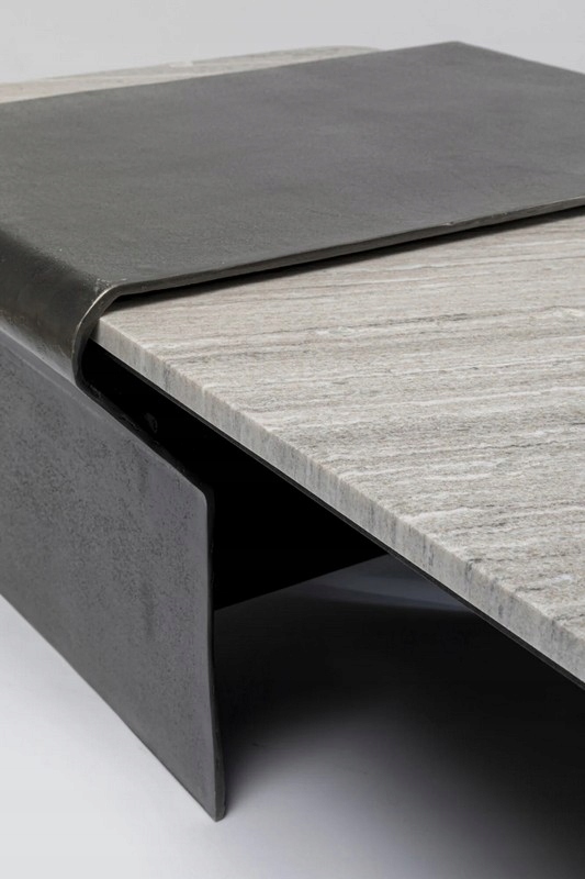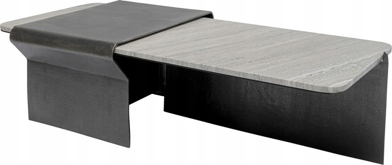 Elegancki, szary marmur został zestawiony z nowoczesną ramą z lakierowanego aluminium w odcieniach czerni i szarości, inspirowaną stylem włoskich mebli.