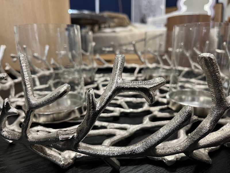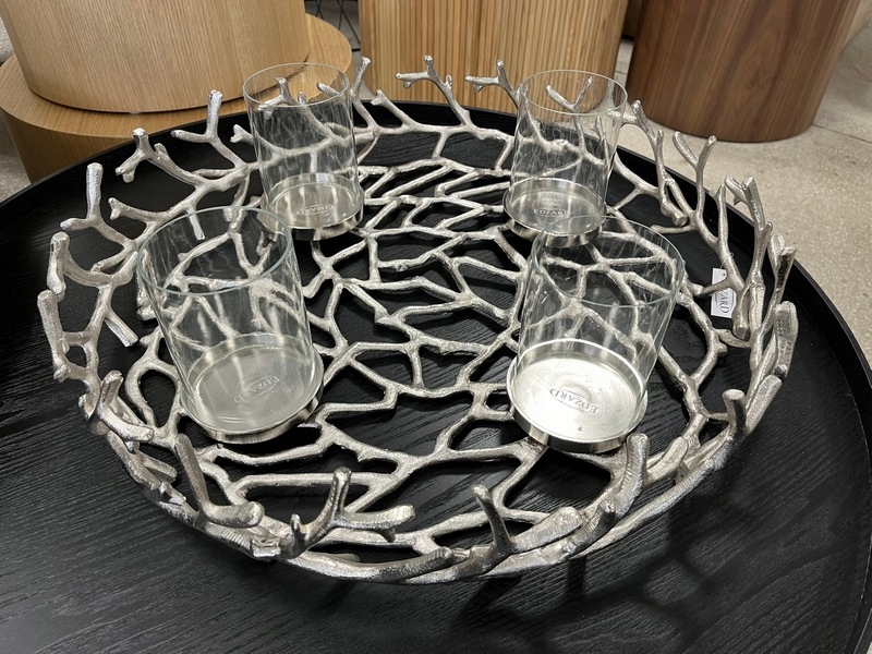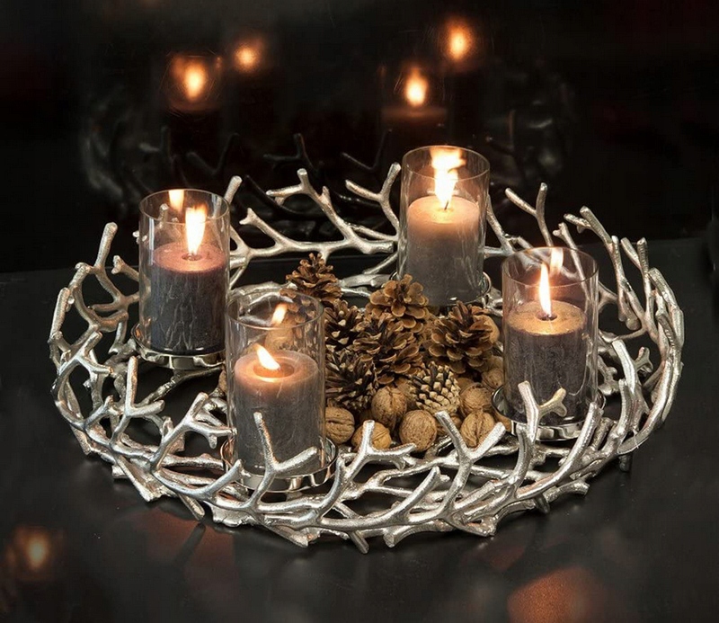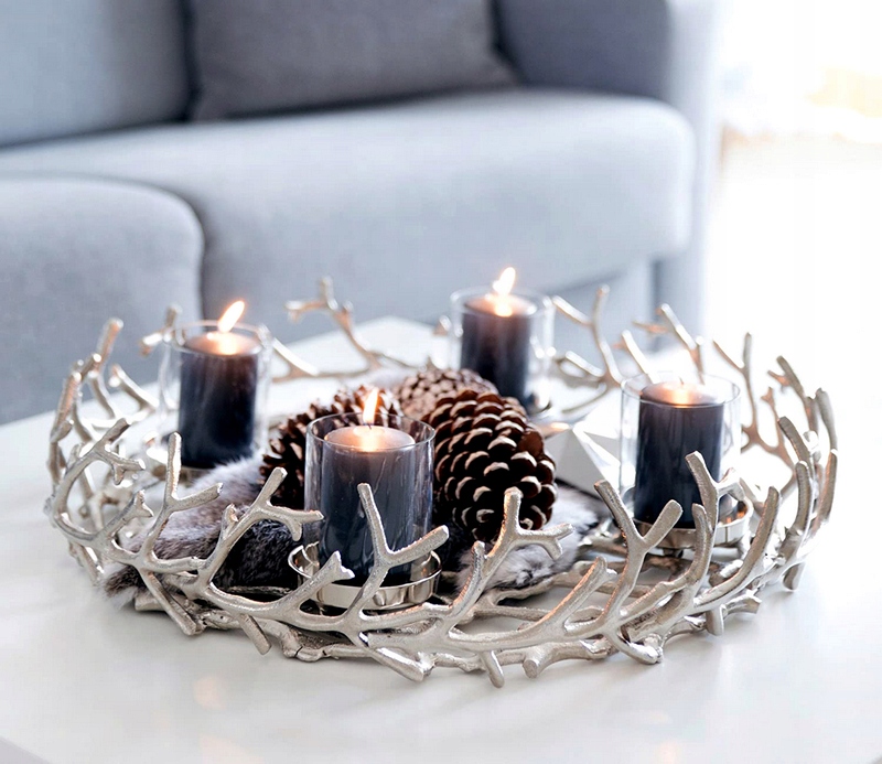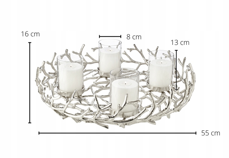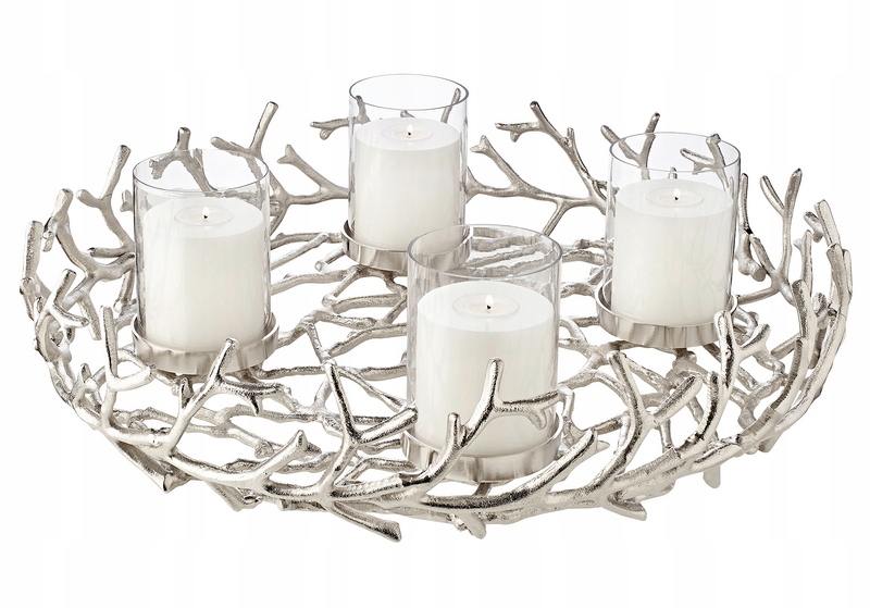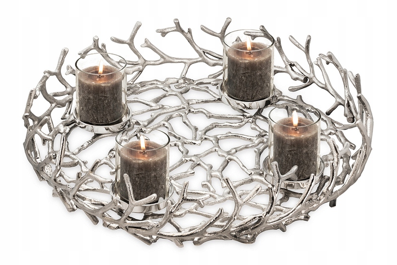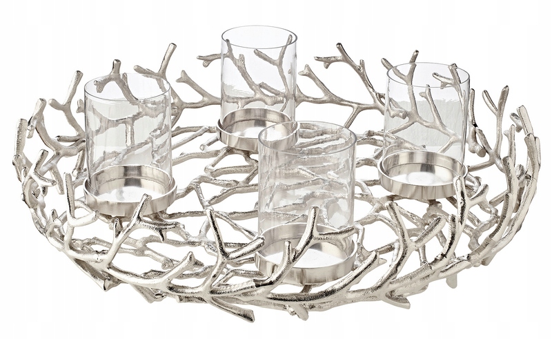 Obszerny, w kształcie wieńca, w srebrnym kolorze przeznaczony jest na 4 świeczki.