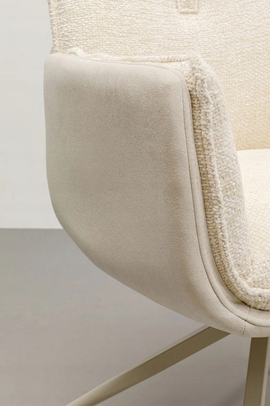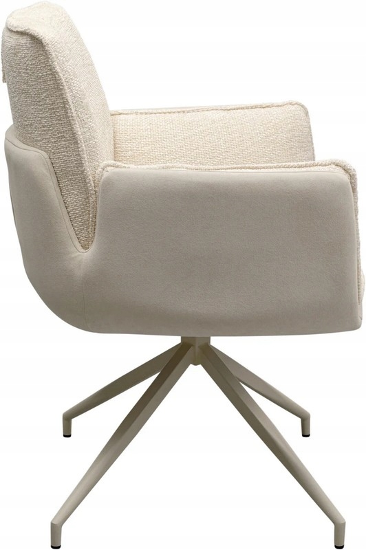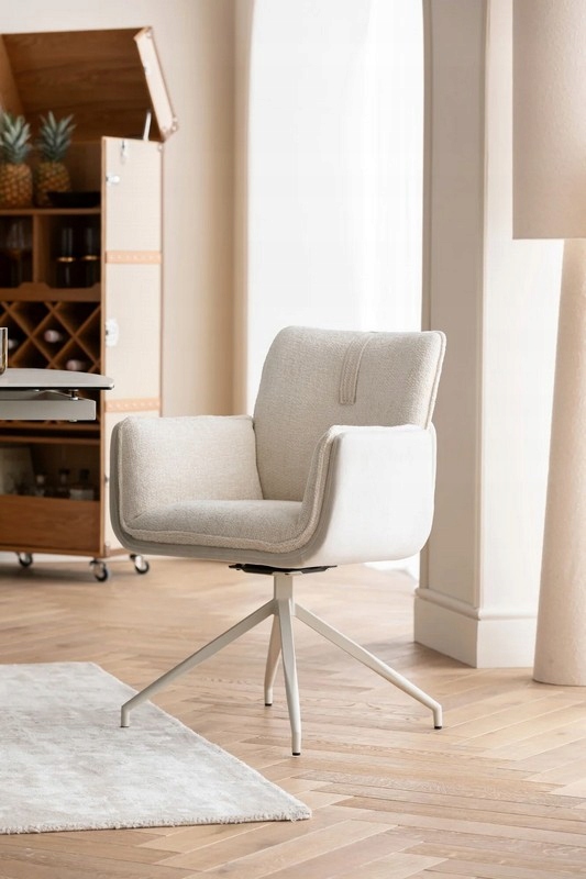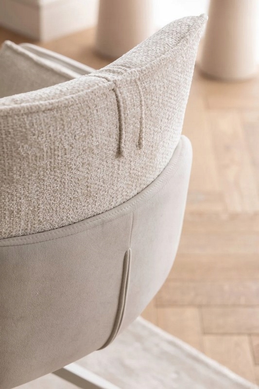 Tapicerka łącząca tkaninę z modnym efektem bouclé podkreśla zaokrągloną, ergonomiczną formę, nadając meblowi luksusowy, a zarazem przytulny charakter.